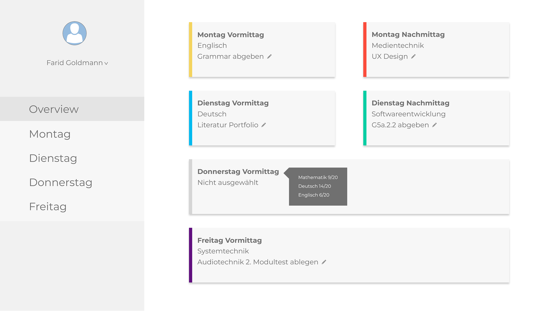 My goal was to make the registration process as effortless as possible. The entire week can be planned from the Overview Page in just a few seconds by right-clicking the cards and selecting the desired class.